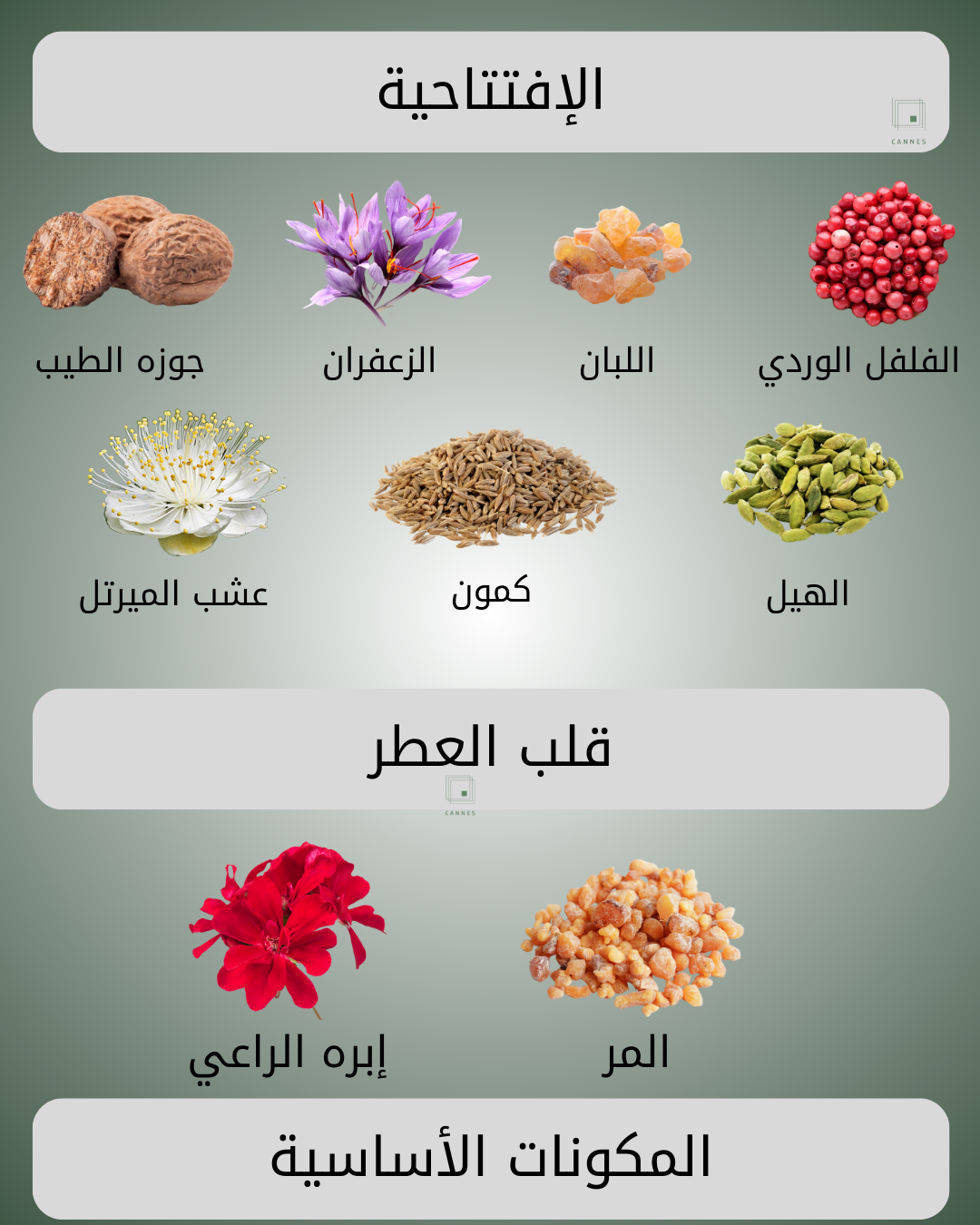 مكوناته الأساسية هي العود النفيس والبتشول والجلد المدبوغ والبخور.