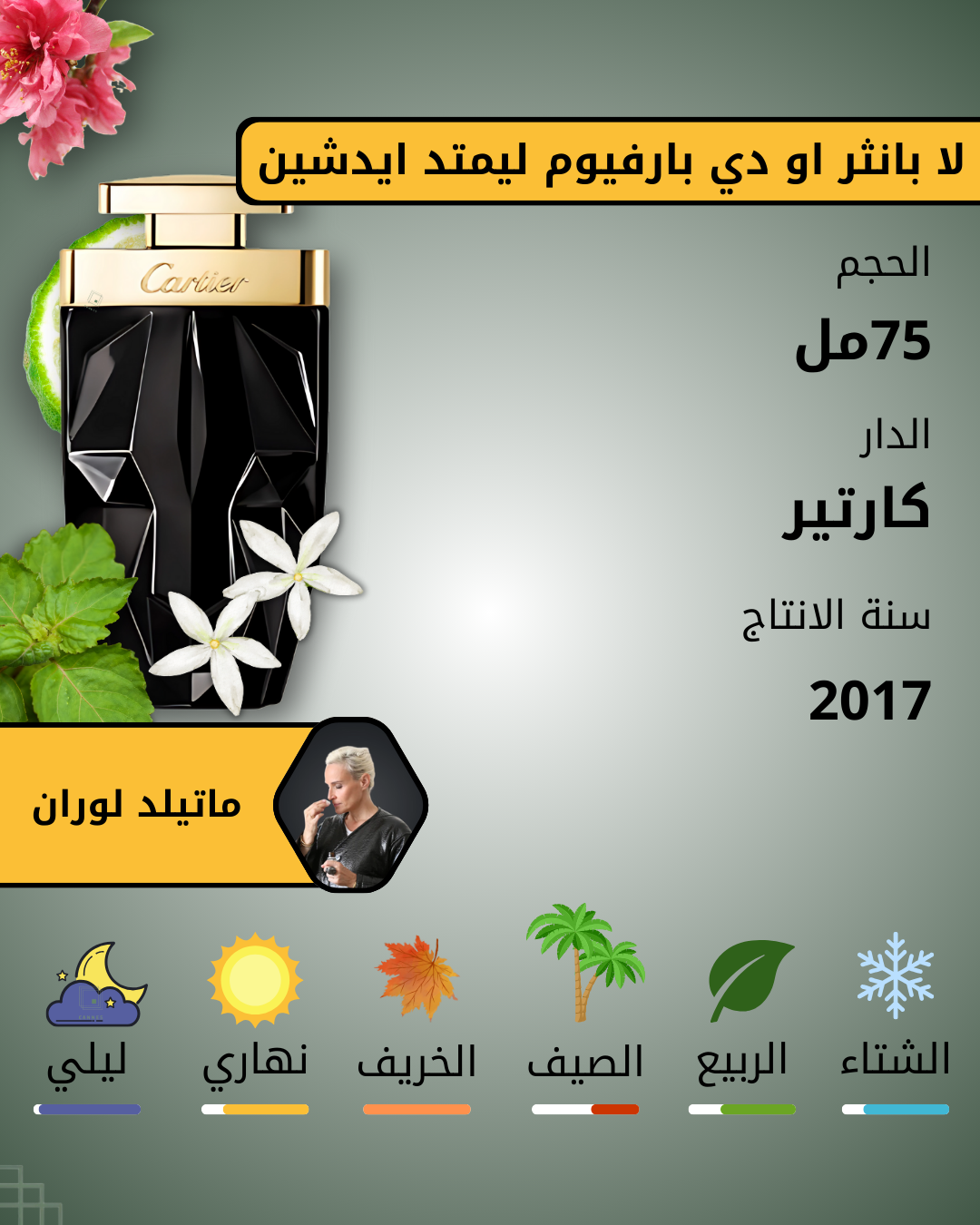 تم إصدار لا بانثر النسخة المحدودة عام 2017 وهو عطر زهري تشيبر للنساء بواسطة صانع عطور كارتير المحلي ماثيلد لوران. يبدأ العطر بمزيج منعش وخفيف لعبق رائحته الأولية العليا من الروبارب والفراولة والفواكة الجافة والينسون. الرائحة الثانوية القلبية تنتج من الجاردينيا وزهرة البرتقال والكمثرة والورد والإيلانغ. يتنهي العطر بأساس أرضي وفاخر من رائحة المسك والإيفرينا الخوخية والبتشول والجلد النفاذ. عطر لا بنتر لميتد إديشن من كارتير حسي وزهري لنساء الحاضر المستقلات الواثقات من أنفسهن.